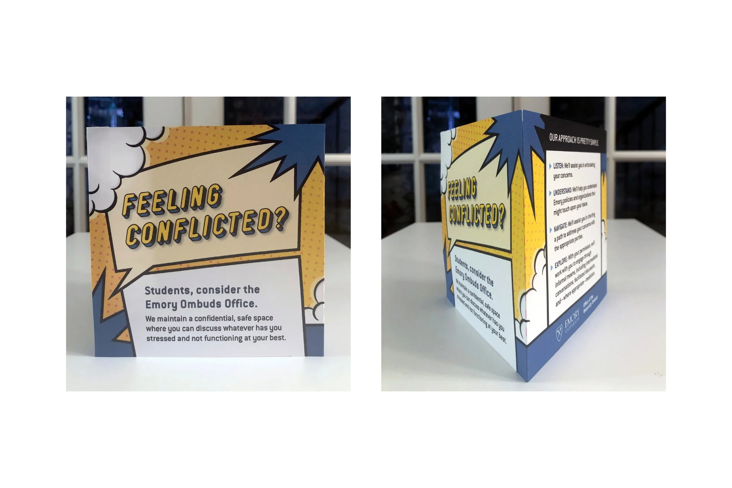 ART DIRECTION & DESIGN TO BRING MORE CAMPUS WIDE AWARENESS TO THE OFFICE OF OMBUDS. THIS PROJECT REQUIRED 2 DIFFERENT DESIGNS IN ORDER TO ATTRACT BOTH FACULTY & STUDENTS TO THE SERVICES THAT OMBUDS OFFERS.